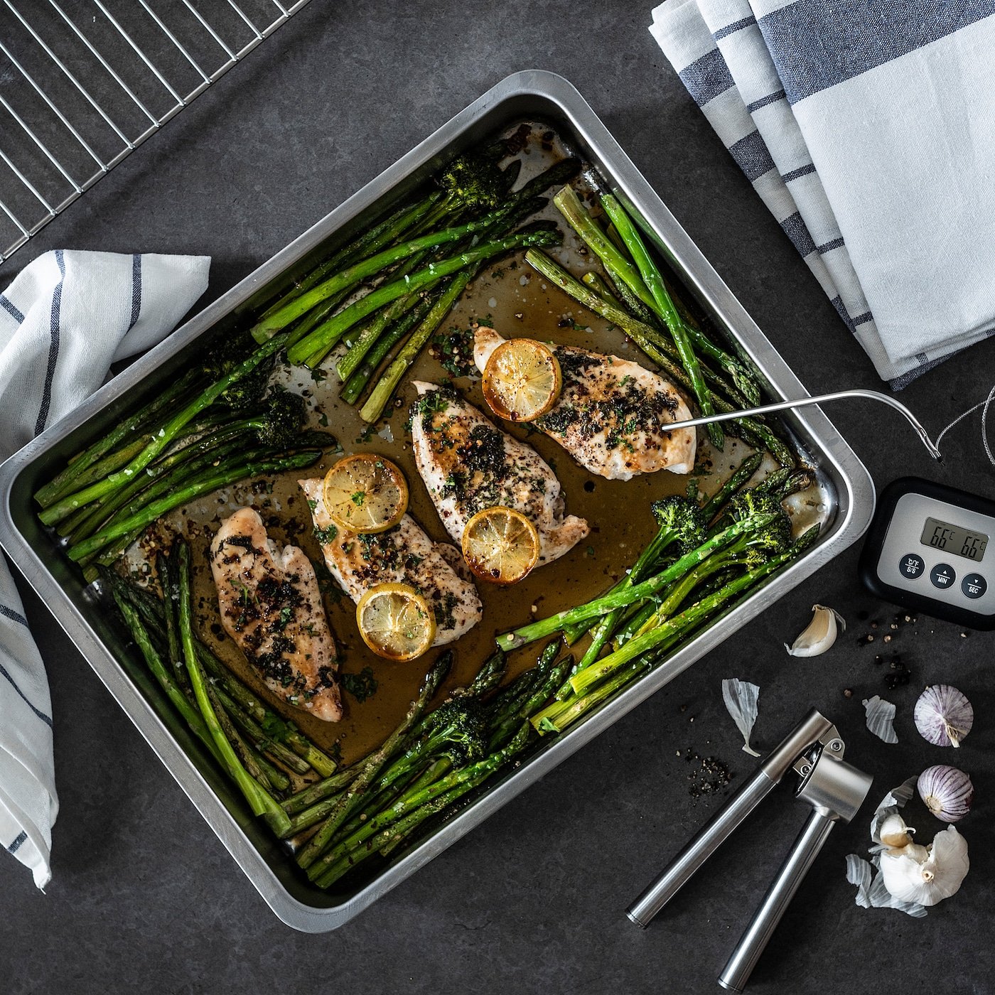 صينية شواء مثالية للاستخدام في الفرن أو للشواء. يوجد في الأسفل مساحة للبطاطس والخضروات وعلى رف الشواء يمكنك وضع الدجاج أو شرائح اللحم.