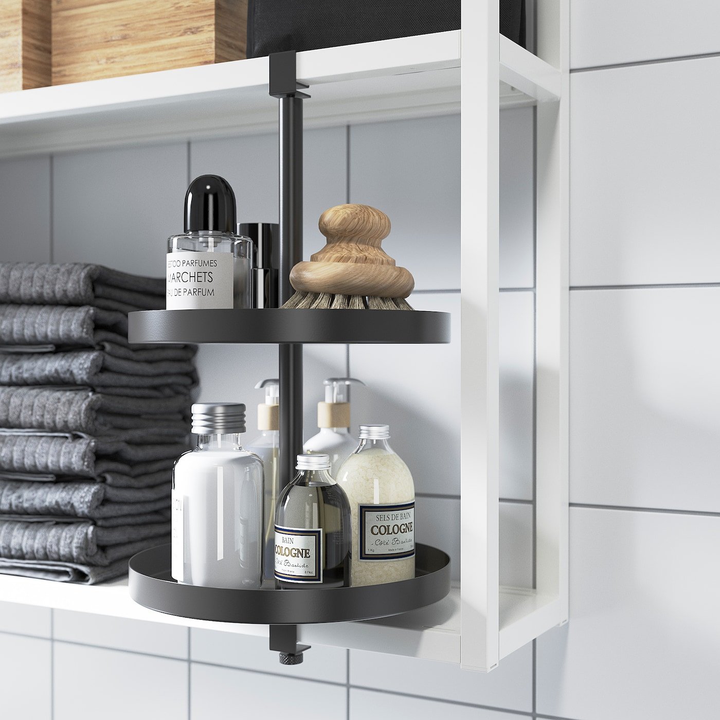 مع هذا الرف الدوار في الحمام، من السهل الإحتفاظ بالمجوهرات، طلاء الأظافر والمراهم منظمة. ربما تريدين وضعه على الجنب أو رف لكل شيْ؟