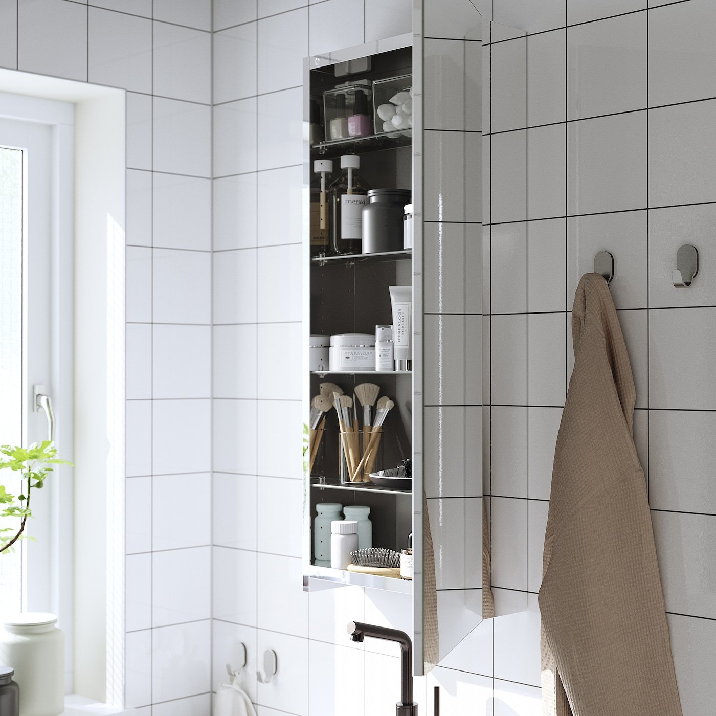 خزانة بمرآة فوق حوض المغسلة تسهل من روتينك الصباحي بينما تعطي حمامك شعور واسع ومشرق. هذه الخزانة ذات الأرفف تحافظ على الأشياء المستخدمة غالبًا مخفية ولكن في متناول اليد.