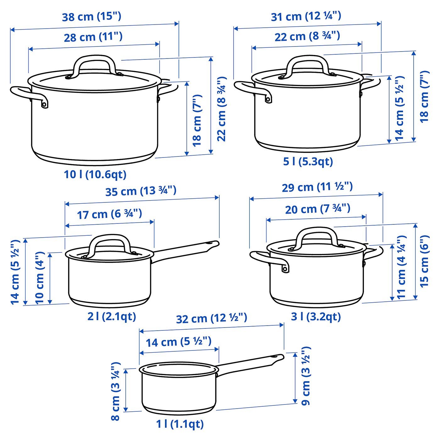 يتضمن: قدر بغطاء (١٠ لتر)، قدر بغطاء (٥ لتر)، قدر بغطاء (٣ لتر)، قدر بمقبض (٢ لتر) و قدر بمقبض (١ لتر).