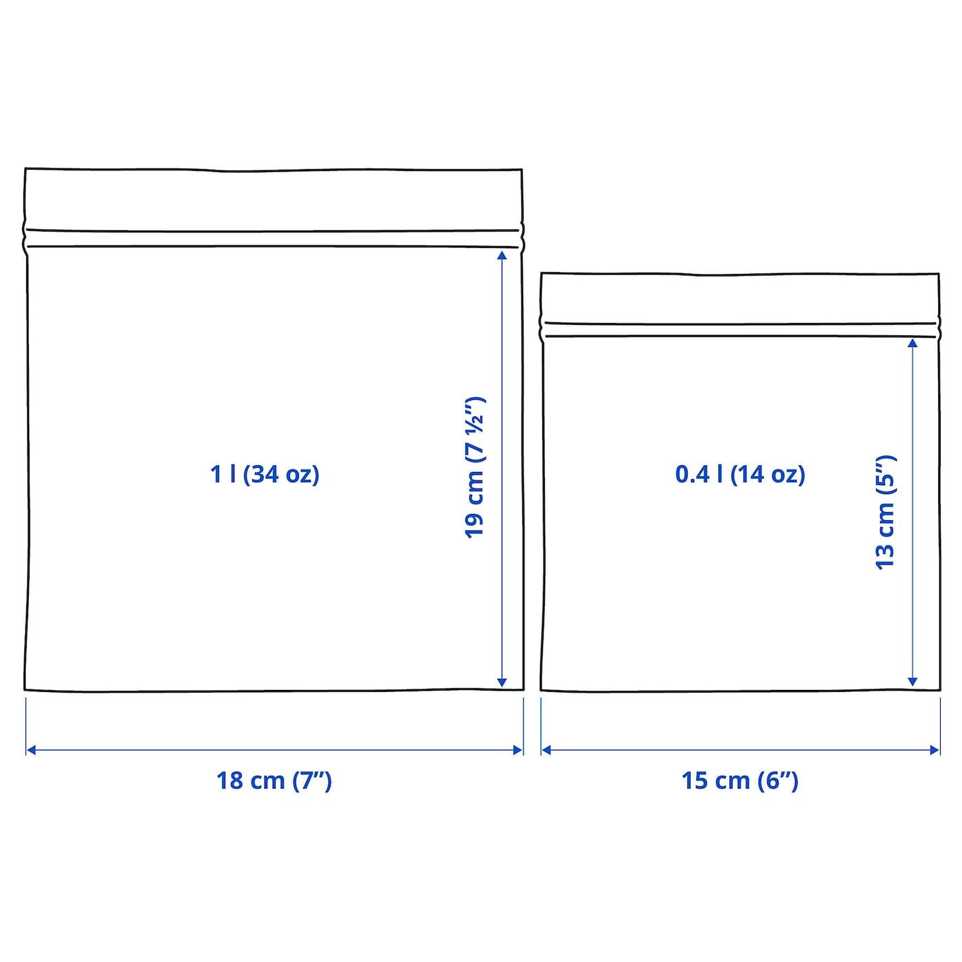 يتضمن: 30 كيس 0،4 لتر (قياس داخلي 15x15 سم) و 30 كيس 1 لتر (قياس داخلي 18x19 سم).