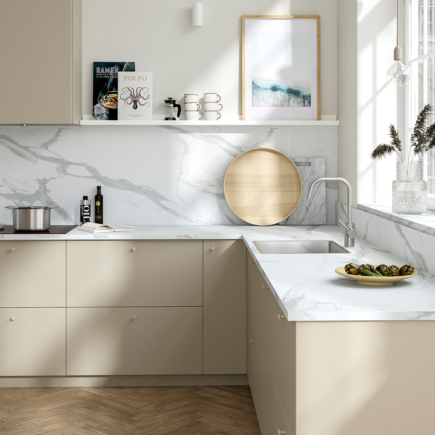 ابتكر مظهرًا متناسقًا تمامًا من خلال الجمع بين سطح العمل هذا مع لوحة حائطية مطابقة.