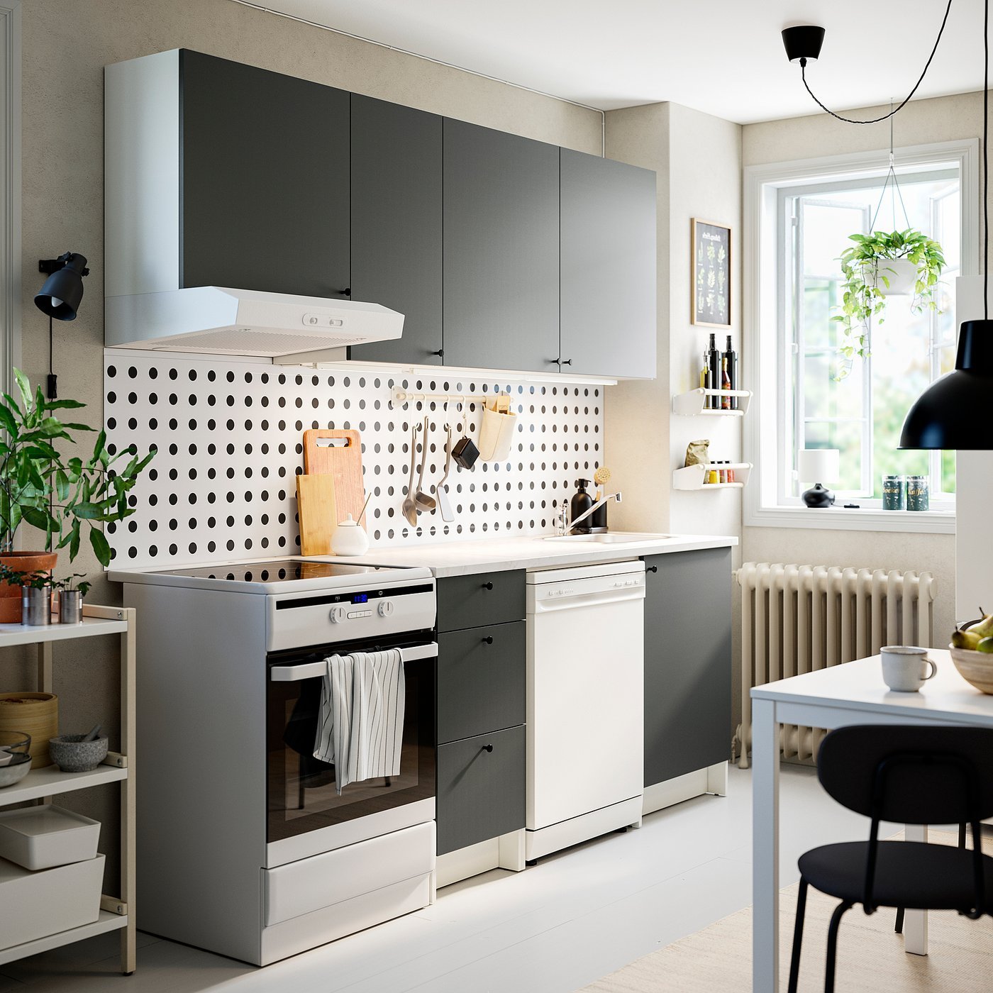 يمكن تركيب غسالة أطباق أو ثلاجة صغيرة أو غسالة ملابس في الفجوة بين خزانتي القاعدة. ويمكن أيضًا إبقاء المساحة مفتوحة لإنشاء منطقة جلوس.