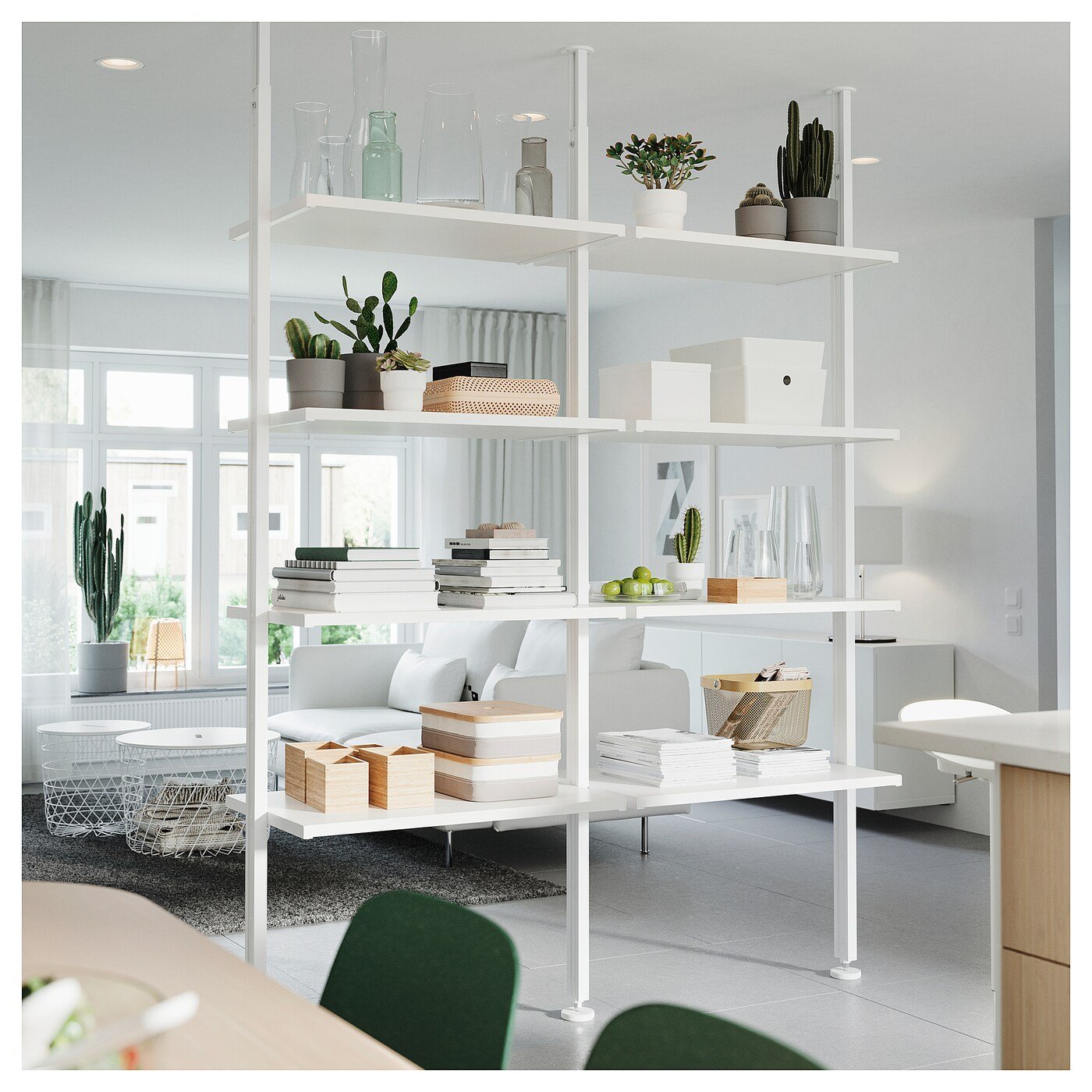 يمكنك وضع حل التخزين المفتوح على الحائط أو تستخدميه كمقسم للغرفة لأن العمود يثبت على السقف.