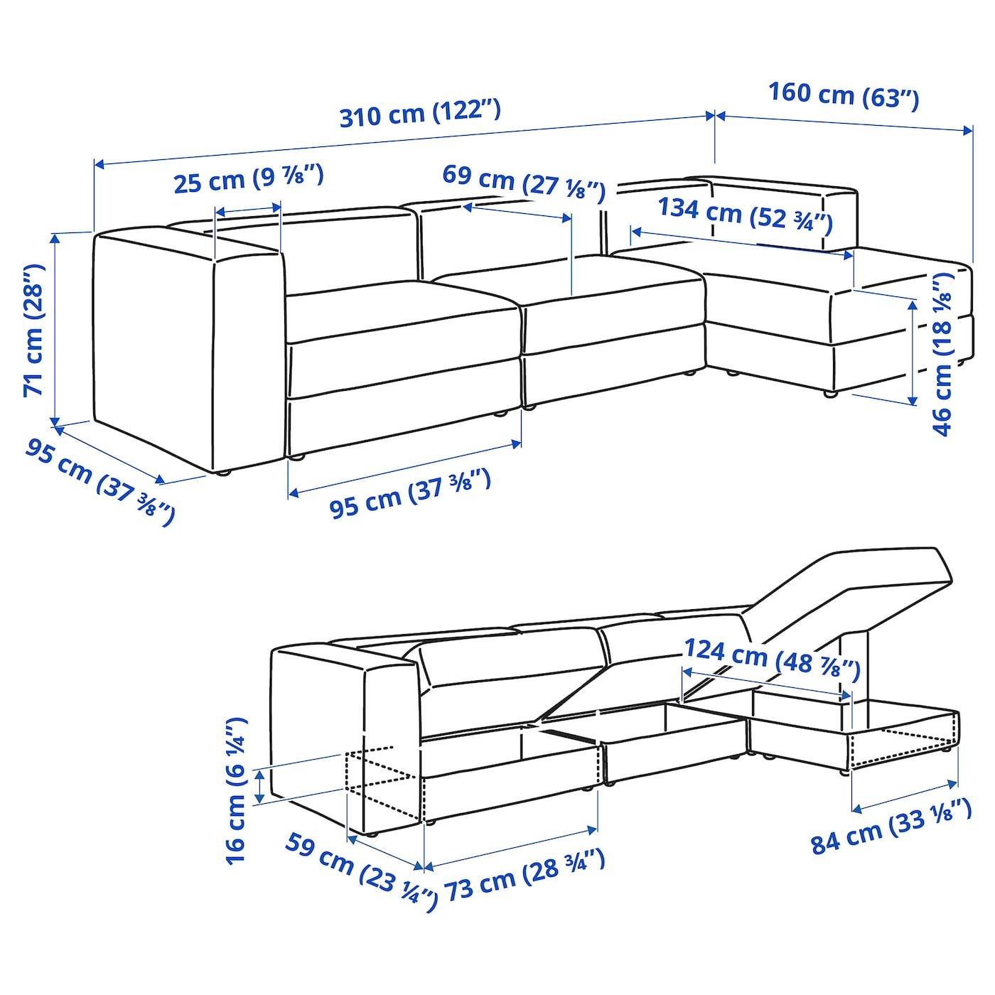 في مساحة التخزين الواسعة أسفل المقعد في الأريكة الطويلة ووحدات المقاعد، يمكنك تخزين أشياء مثل الأغطية والألعاب والصناديق التي تحتوي على أشياء صغيرة.