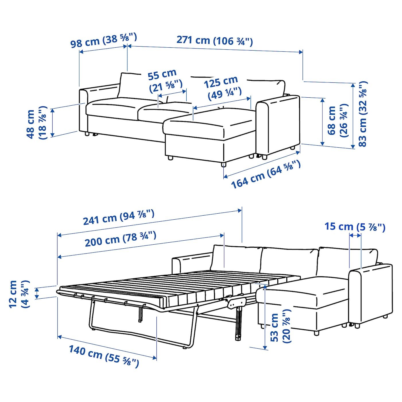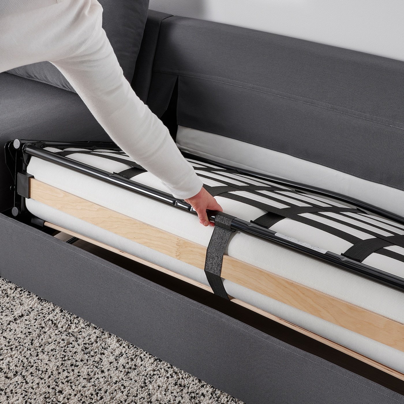 تتحول الكنبة بسرعة وسهولة إلى سرير فسيح ومريح عن طريق إزالة وسائد المقعد والظهر وسحب الإطار السفلي. مكان نوم مثالي لك أو لضيوفك.