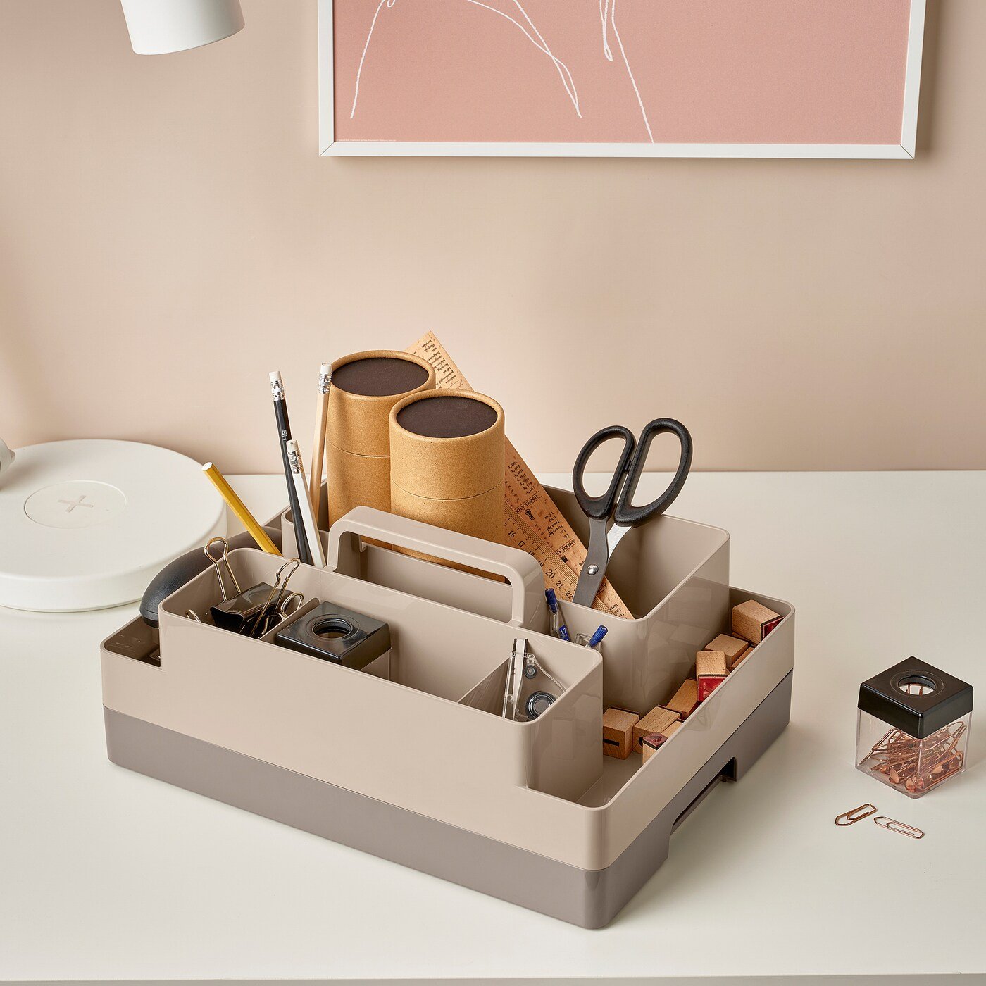 هل تحتاجين إلى مزيد من التخزين على نفس السطح؟ يتناسب طقم منظم المكتب بشكل مثالي مع صندوق KUGGIS مع غطاء (26x35 سم) والذي يباع بشكل منفصل.