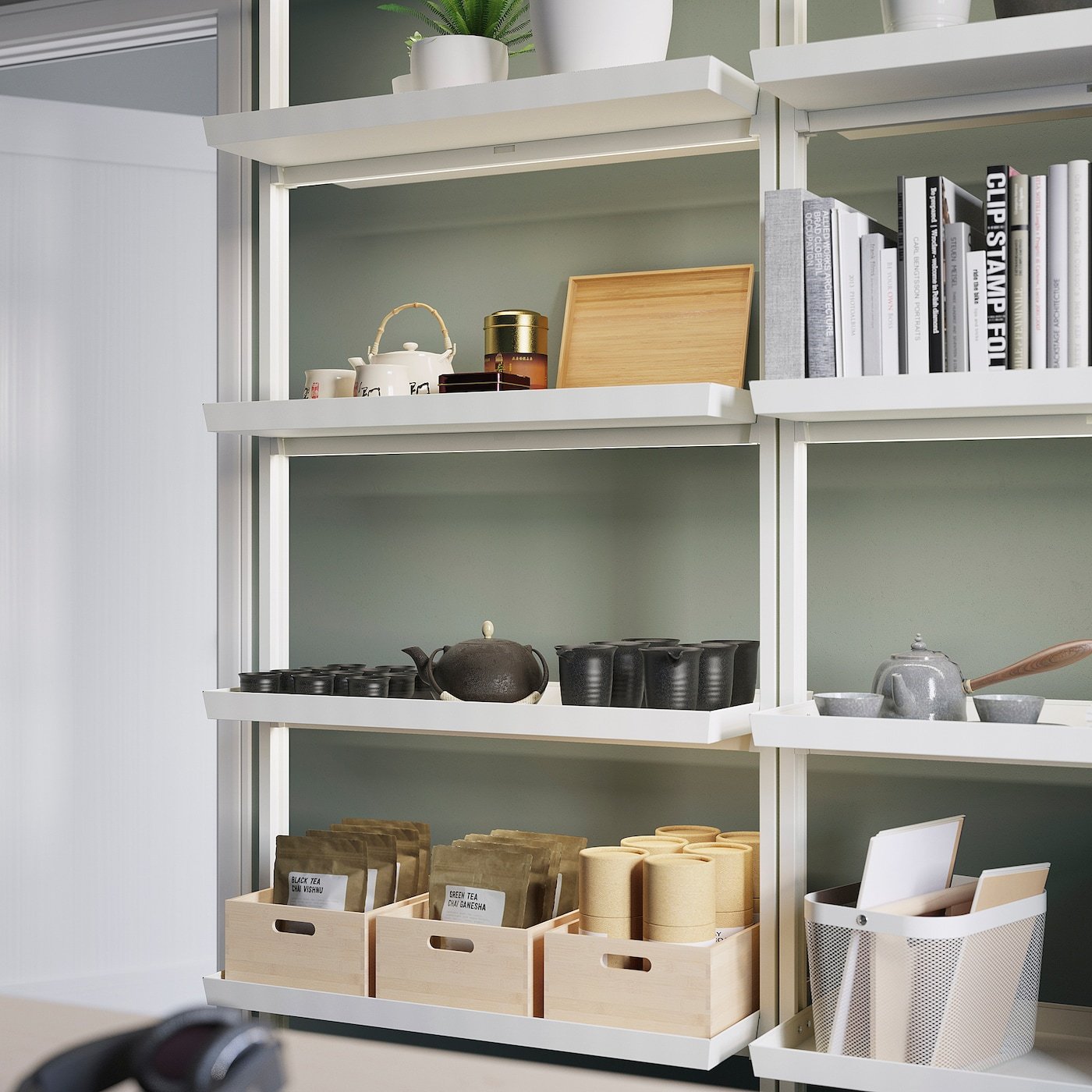 4 رفوف كبيرة الحجم لعرض العناصر أو لتخزين الأشياء مثل المجلدات والكتب واللوازم المكتبية. حواف مرتفعة تمنع الأشياء من السقوط.